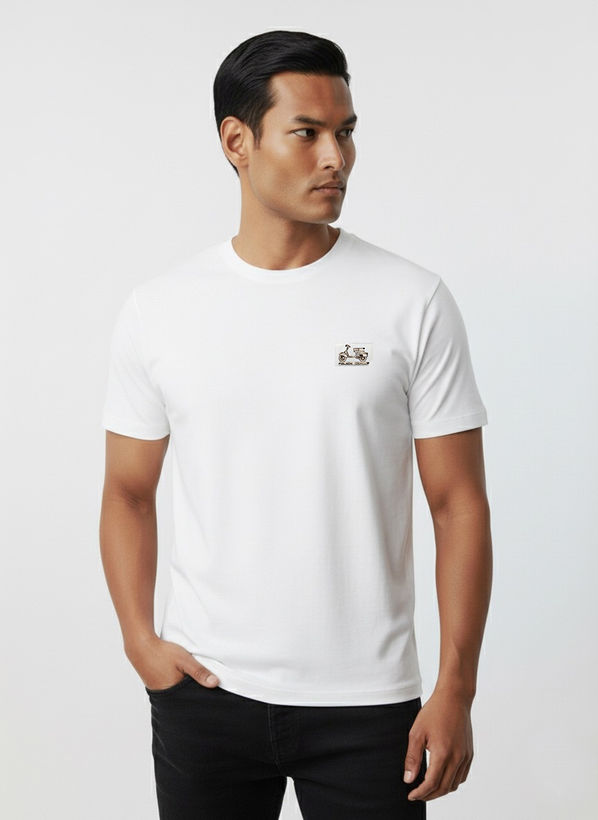 T-shirt z luksusowej bawełny; supima 100% , z emblematem Vespy, logo ze stali nierdzewnej, szczotkowanej.